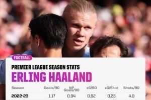 哈兰德本赛季每90分钟射门4.4次、进1.36球,均创英超生涯新高