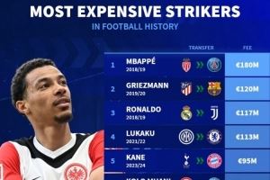 体育资讯7月24日讯 德国转会市场统计了足坛历史前锋(中锋)的转会价格,并列出榜单,从法兰克福转会利物浦的埃基蒂克排名并列第5位。